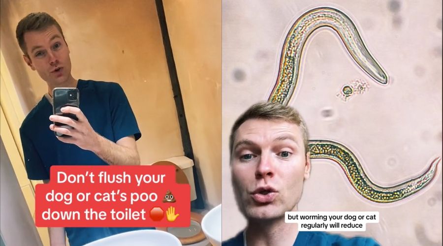 英國網紅獸醫班恩(Ben)於Tiktok貼出一段影片,呼籲飼主不應該將寵物排泄物沖進馬桶,因為貓狗糞便中可能藏有人畜共通的「弓蛔蟲」(Toxocara),這種蠕蟲寄生蟲就算經過高溫廢水處理,也無法徹底將它們消除,而人類對「弓蛔蟲」來說是中間宿主,雖然人體腸道不會發育出寄生幼蟲,但若不小心喝下含有蟲卵的水,人體也可能會受到感染。