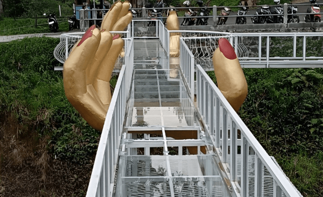 位在印尼中爪哇省的The Geong,是當地熱門觀光景點,在今年4月間對外開放10公尺高的高空步道,橋面以透明玻璃打造,同時以金色大手造型裝置點綴,神似越南峴港的巴拿山佛手天空步道。