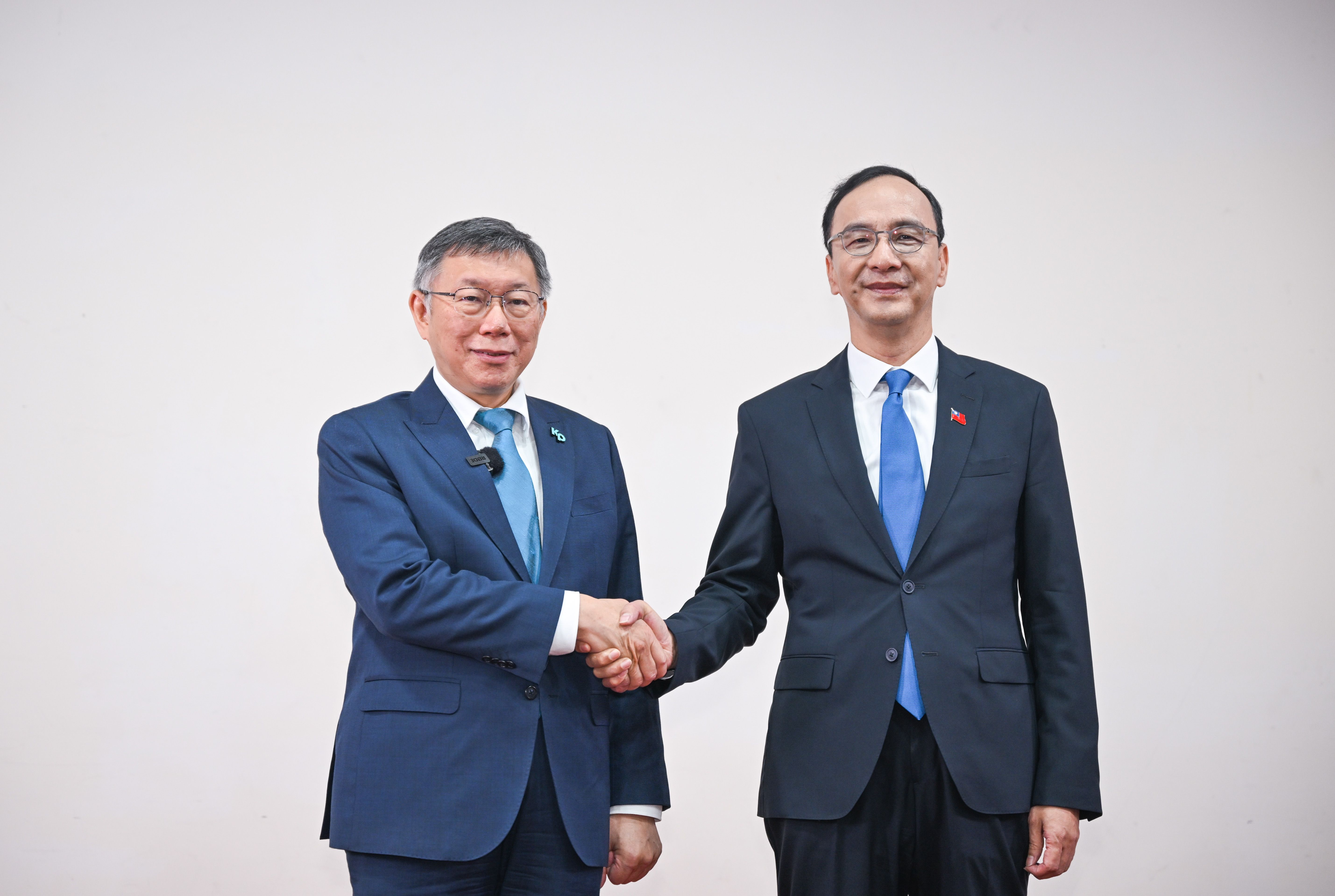 「藍白合」首場政黨協商會議結束後,國民黨主席朱立倫、副祕書長江俊霆、民眾黨主席柯文哲、柯文哲辦公室主任周榆修一同出席會後聯合記者會,會中發布4點共同聲明,一、共同進行台灣第三波民主改革,避免一黨獨大、贏者全拿的民主獨裁,更進一步深化民主。