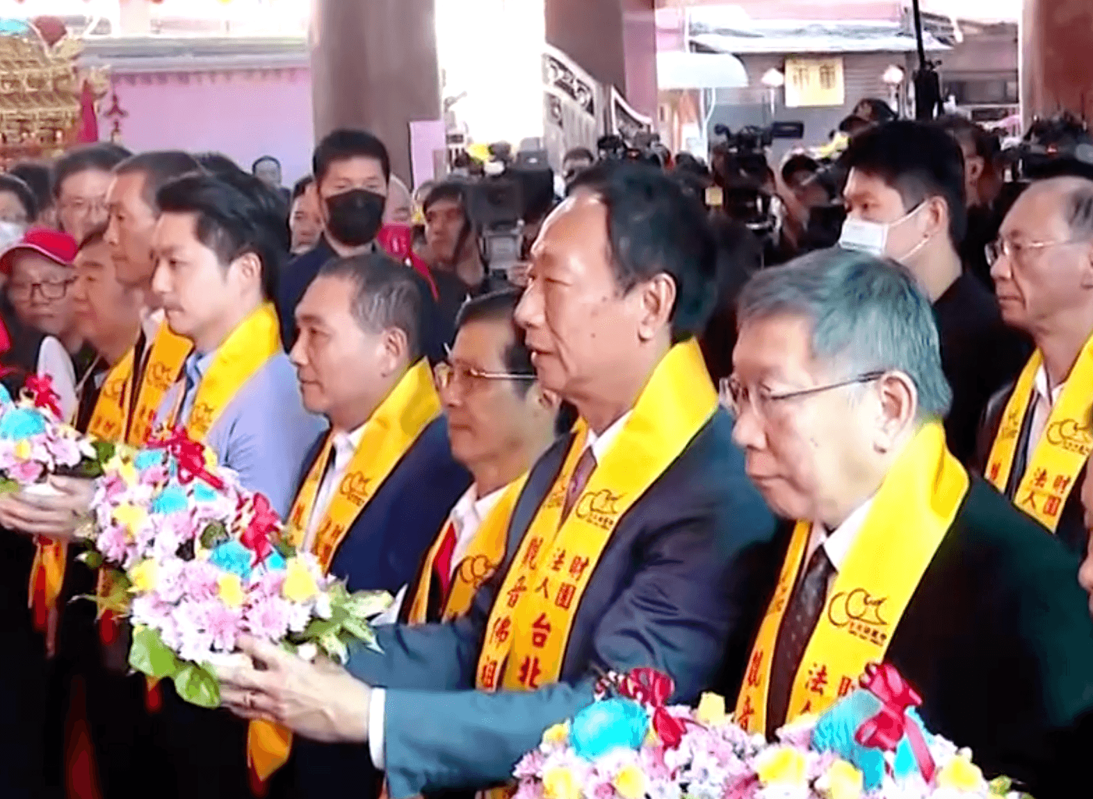 在野陣營3位總統候選人同台!2日上午國民黨候選人侯友宜、民眾黨候選人柯文哲以及郭台銘,皆到士林葫蘆寺出席北宮媽祖起駕大典。不過原本座位侯友宜和柯文哲是安排坐一起,但在侯友宜到場前10分鐘,廟方人員調整座位,改成柯文哲、郭台銘一起,中間是葫蘆寺的董事長,再來才是侯友宜和蔣萬安。