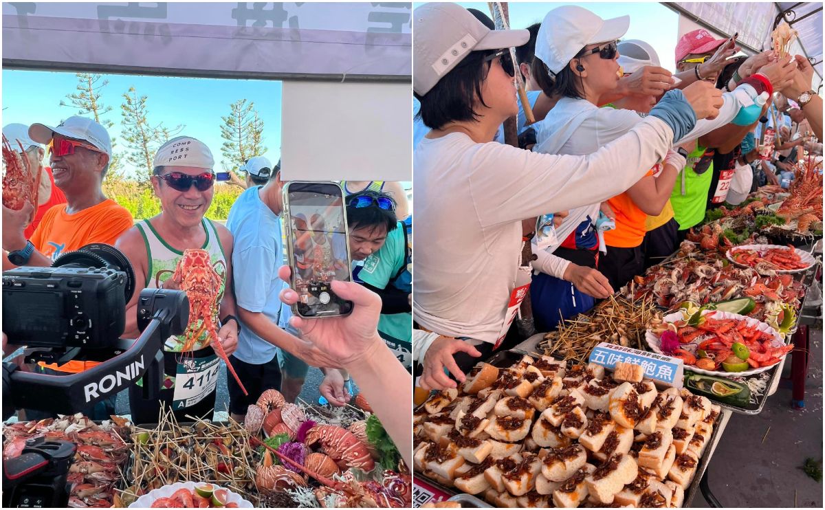 一年一度的菊島澎湖跨海馬拉松今(5日)早6時30分鳴槍起跑,現場的補給站是活動一大亮點,攤位上擺滿螃蟹、鮑魚、蝦子、龍蝦等各式海鮮,主辦單位一共設置9站美食補給站、提供超過70種具有在地特色的料理,就等跑者來補充體力,不過跑太慢可是吃不到。