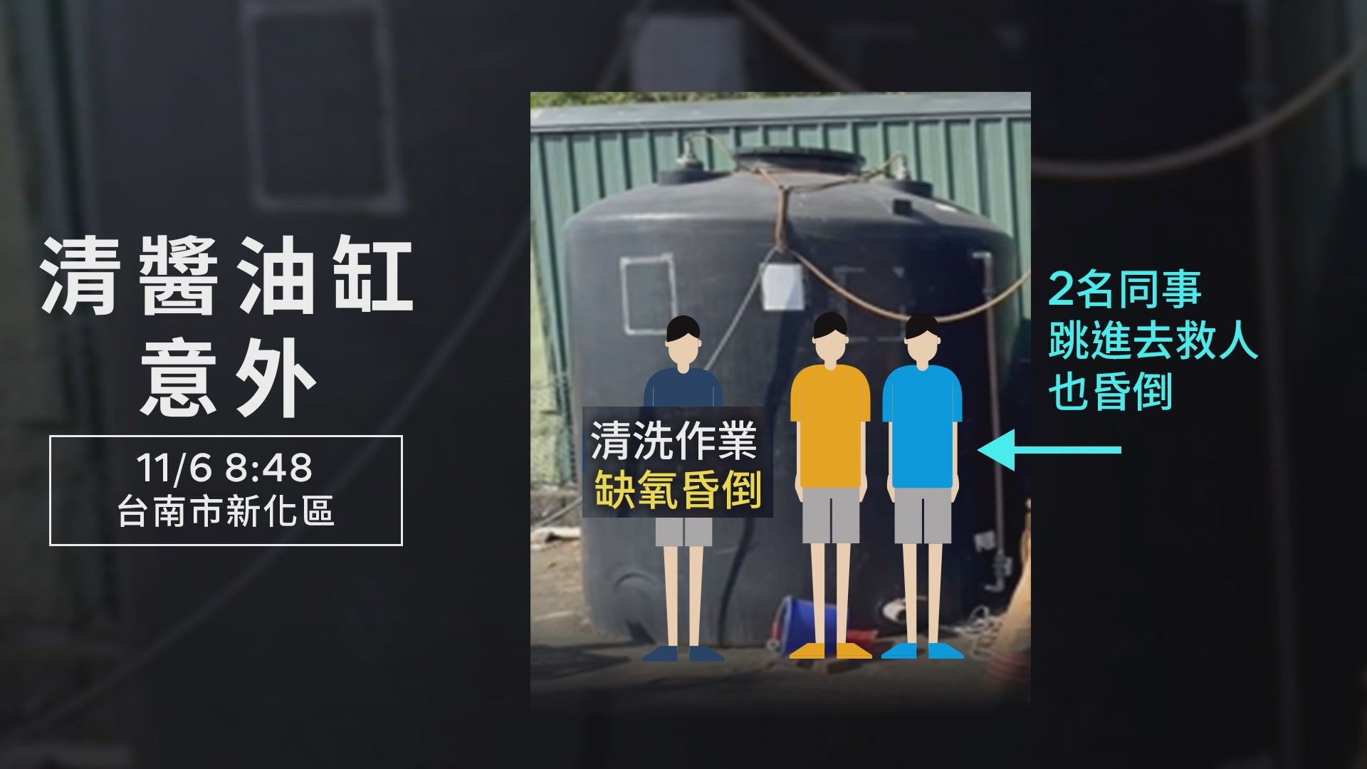 事情發生6日上午8時許,工人進入2米高的醬油槽內從事醬渣清理作業,疑似因缺氧中毒暈倒,2名同事見狀進入槽內搶救,結果也暈倒於槽內,外頭同事趕緊拿切割器破壞醬油槽救人,救出時其中2人失去呼吸心跳。急救後雖都恢復生命跡象,但最早進去的工人仍然以葉克膜急救中,尚未脫離險境。