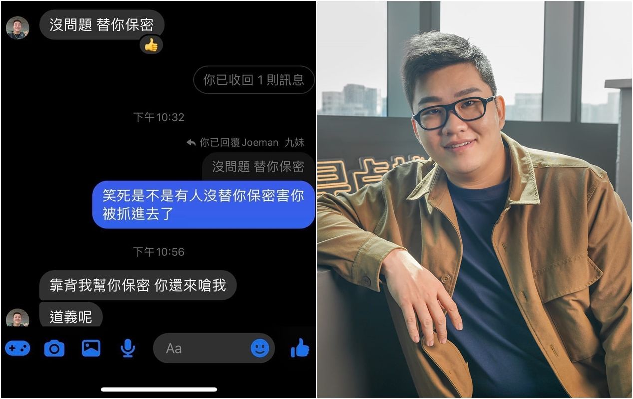 Joeman爆發涉毒風波後,網路流傳一張截圖疑似他與某網友的私訊對話,該名網友向他分享一個秘密,「我們班有班對欸,好好笑,是真的喔」,還叮囑Joeman一定要保密,不要跟別人講,而Joeman也回應:「沒問題,替你保密。」沒想到這名網友得知Joeman被捕,竟又傳訊「笑死是不是有人沒替你保密害你被抓進去了」,獲得「X杯我幫你保密,你還來嗆我,道義呢」的率真回應。