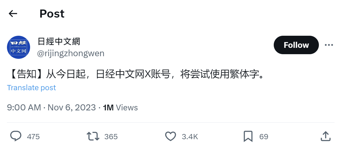 《日本經濟新聞》推出的《日經中文網》主要提供財金、金融及國際等各類報導,至今累計多達52.9萬人追蹤,原以簡體字為主,不過昨(6日)無預警於X平台宣布,「從今日起,日經中文網X帳號,將嘗試使用繁體字」。