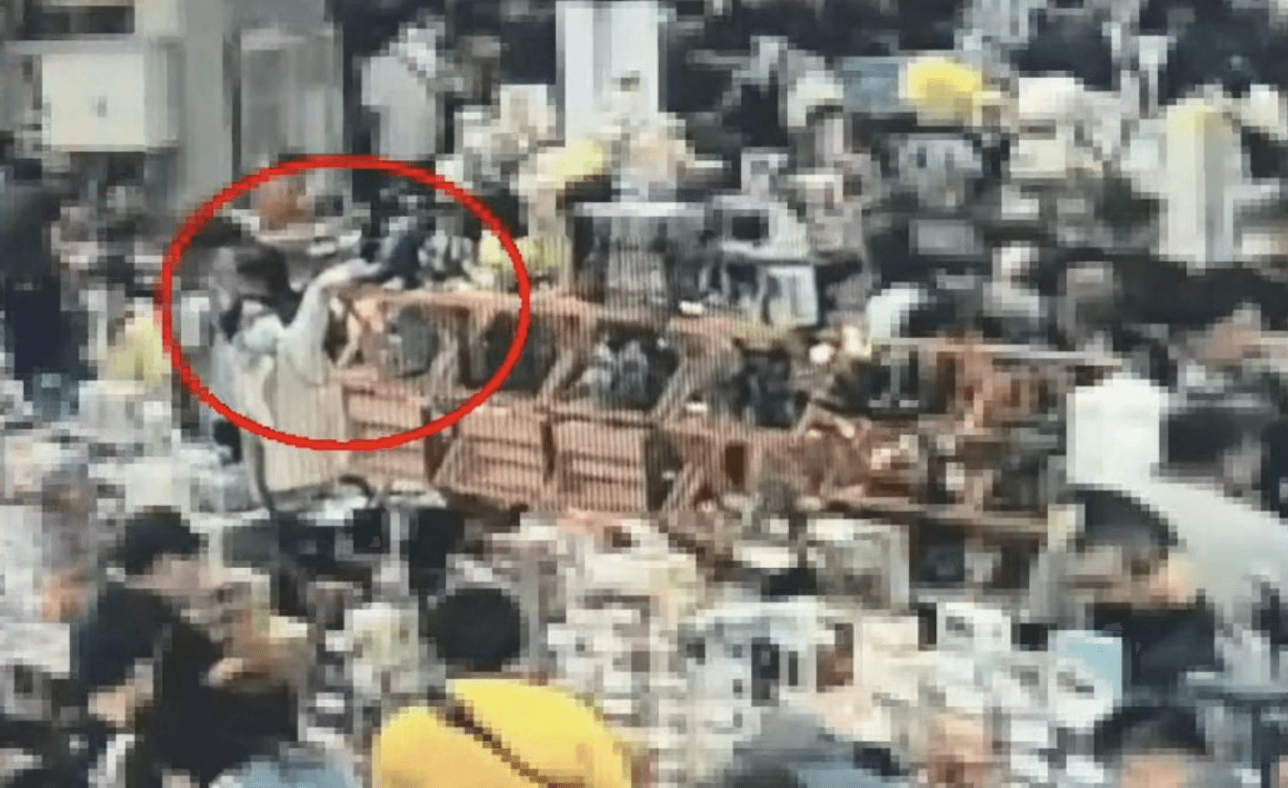 警方調閱會場監視器畫面,發現一名戴眼鏡、口罩的男子默默靠近貨架,並趁著人潮眾多、店員不注意時,伸手拉哥吉拉公仔的尾巴,隨即將哥吉拉順手偷走,從並貨架後方離開,手法相當俐落。