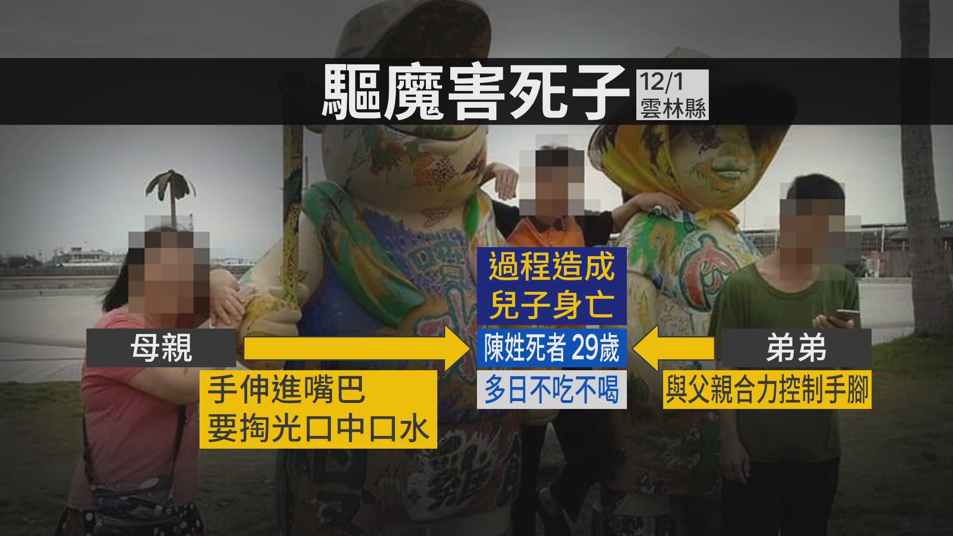 據了解,陳家一家四口同住,長子近期情緒反覆,曾多日不進食,家人參加廟會時被告知可能是「卡到髒東西」,疑似決定自行處理,案發當晚,全家人深夜強押長子到3樓神明廳,讓他跪在神明桌前,父親幫忙壓手、背,弟弟負責壓腳,而母親進行主要儀式,過程中長子失去意識,送醫不治。