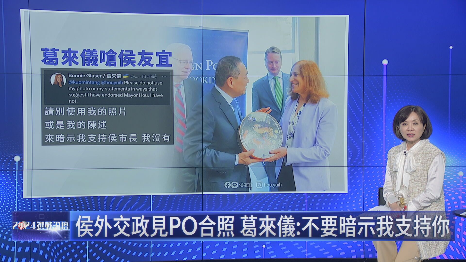 選戰倒數,藍綠白搶端政策牛肉,只不過國民黨總統候選人侯友宜提出國防外交政策白皮書時,卻未經同意,使用美國兩岸印太知名學者葛來儀照片,引發葛來儀不滿,第一時間在社群媒體上發文,標註國民黨跟侯友宜,要求不要用她的照片。2024選戰論壇主持人王時齊訪問資深媒體人林育卉,請她就藍綠白三組總統候選人的外交表現予以評比,林育卉表示,從侯辦誤用葛來儀照片一事,就可以看到出來,他們對於外交事務毫無專業!這個舉動是「非常非常沒有禮貌」,因為演講或宣傳要用到他人照片都應該事先打招呼,這是做人做事的基本道理。
