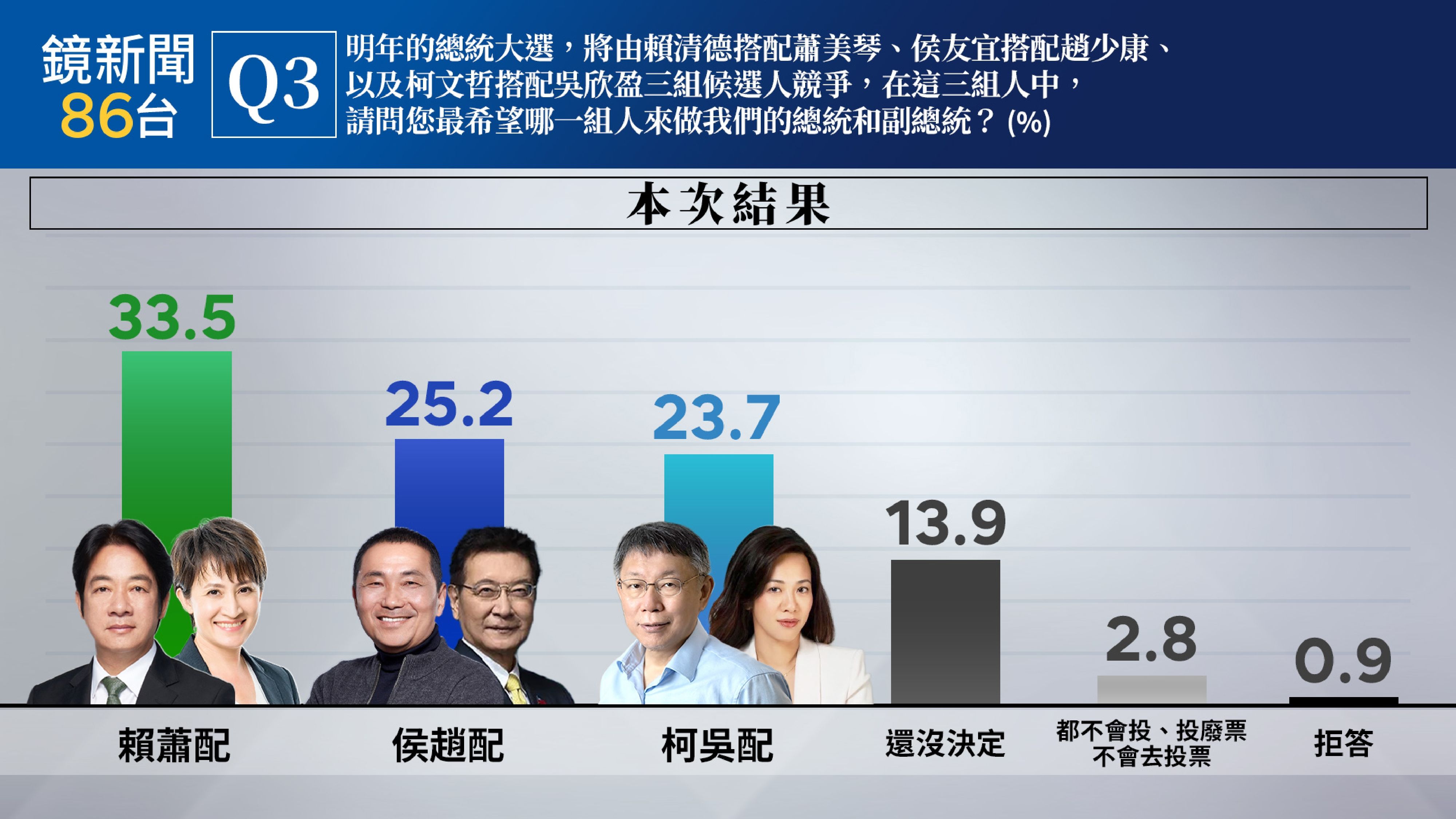 《鏡新聞》最新民調 賴蕭配33.5%居冠 侯趙25.2%居次 柯吳23.7%緊追