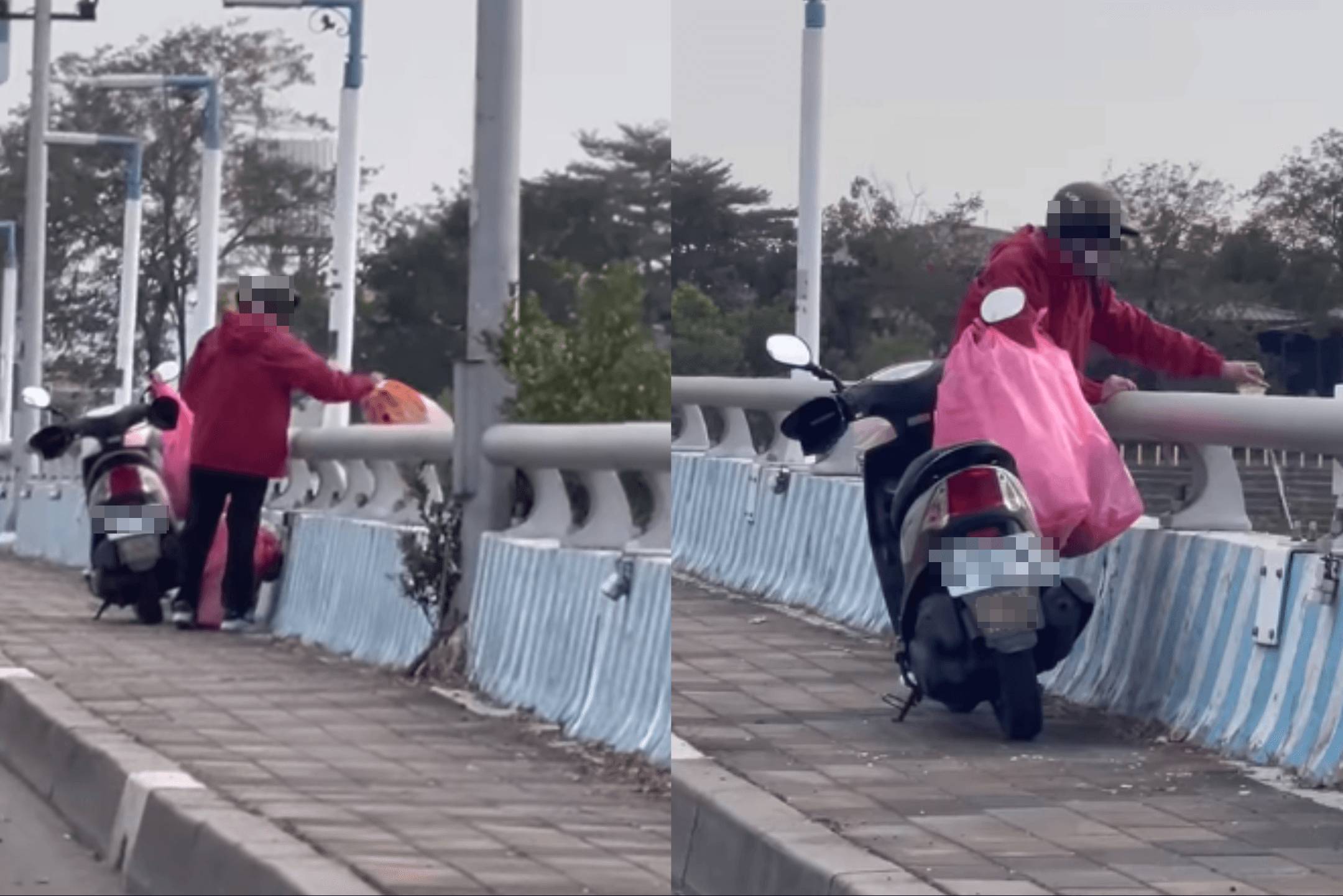 有網友昨(12日)於臉書社團「嘉義綠豆大小事」發布一則影片,婦人將機車停在中埔鄉忠義橋的行人道,而車上還載滿兩大袋不明物品,可見婦人從塑膠袋裡掏出10多條吐司與數盒牛奶,直接往八掌溪裡傾倒。