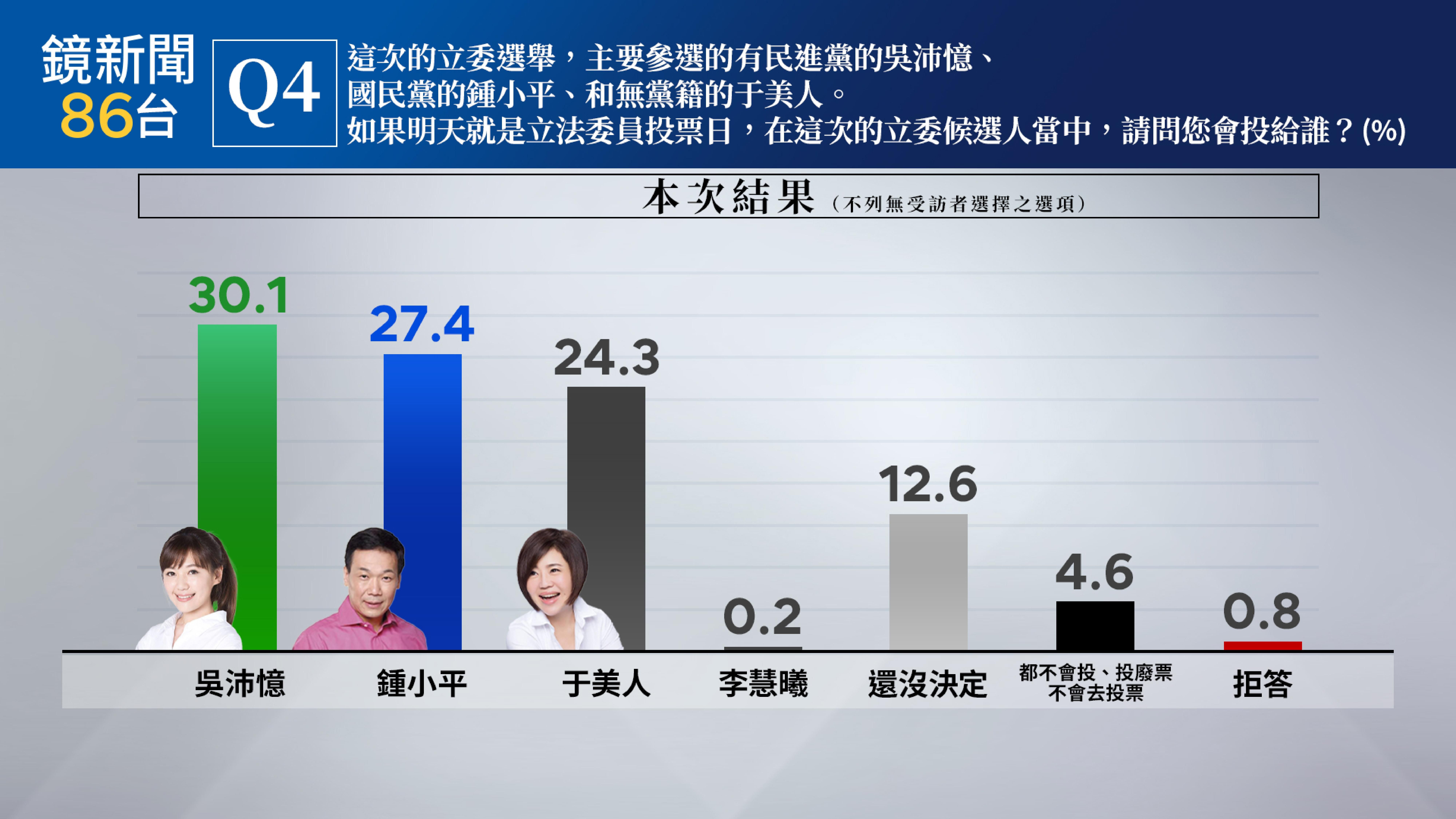 看好度拚戰!吳沛憶33.5%領先 鍾小平29% 于美13.8%最低