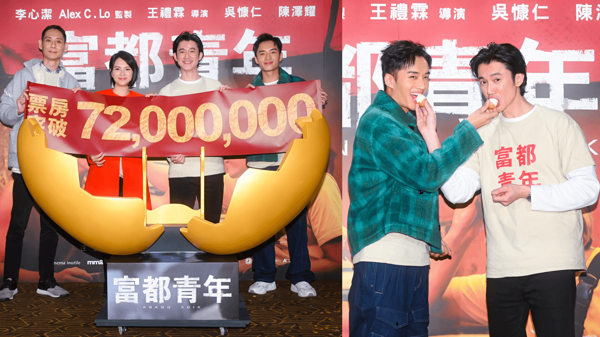由金馬影帝吳慷仁、陳澤耀主演的電影《富都青年》,上映後叫好叫座,不僅在香港、馬來西亞都締造票房佳績,在台也賣破7200萬,監製李心潔與導演王禮霖今率《富都》兄弟檔合體慶功,記者會也重現電影經典敲蛋場面,吳慷仁期待表示:「希望耶誕節及跨年的票房能再接再厲,等到下一個里程碑的時候,我們再出來跟大家見面。」盼望電影票房持續衝破億。