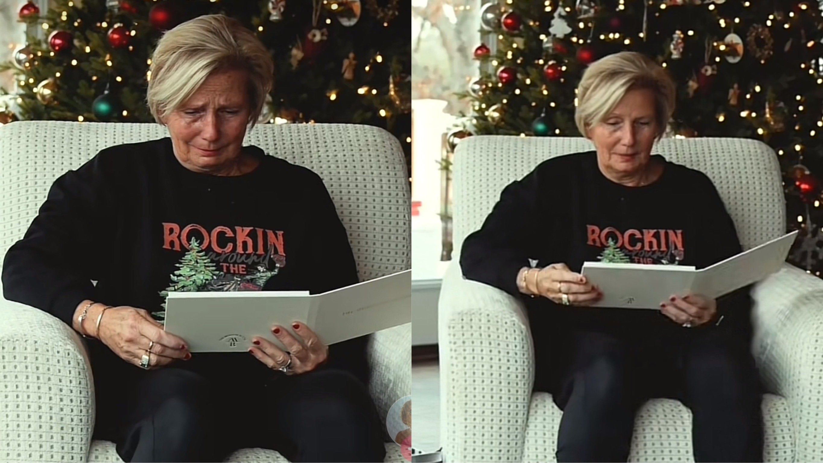 影片顯示,菲利浦的媽媽看著數位卡片,忍不住激動落淚,只見上面顯示數張合照,並搭配以AI模仿「爸爸」聲音講出「嗨,親愛的,我愛妳,妳的禱告我都有聽到,我想要妳知道,妳是孩子們最棒的母親、是全世界最堅強的女人,我永遠都在妳身邊,祝福妳們有個愉快的耶誕節」。