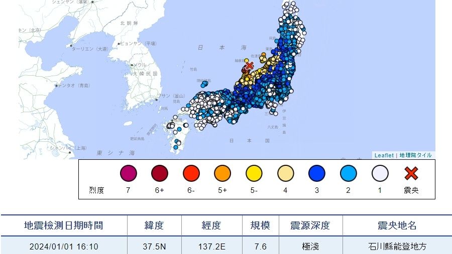 日本在今(1日)台灣時間下午3時10分,石川縣能登地區發生規模7.6地震,最大震度7,目前已發布海嘯警報。