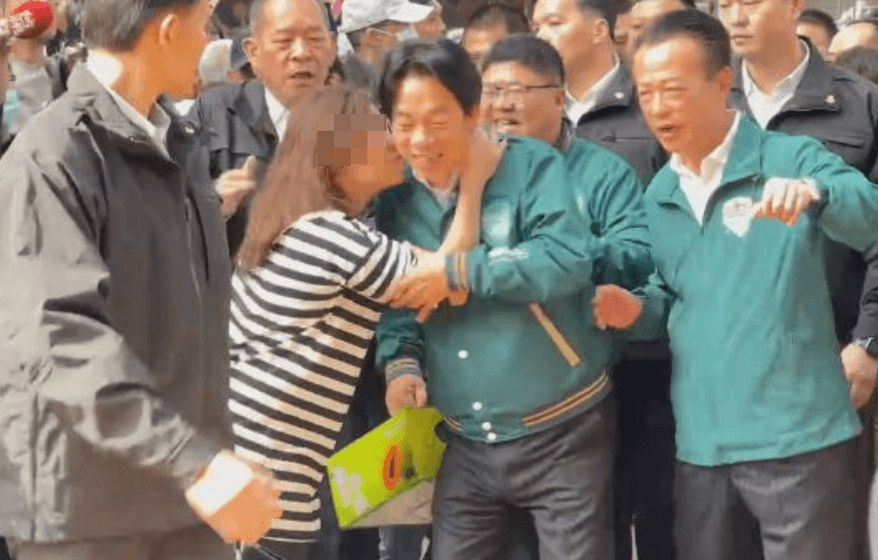 一名女支持者拿著手機上前與賴清德自拍後,突朝賴清德伸手,原以為女子是要擁抱賴清德,下一秒女子卻攬住賴的脖子、親吻他臉頰,「突襲式」的舉止讓眾人反應不及,只能露出驚恐神情,一名隨扈見狀則趕緊將女子拉開,賴清德雖略感驚嚇,仍向女子揮手致意才離場。