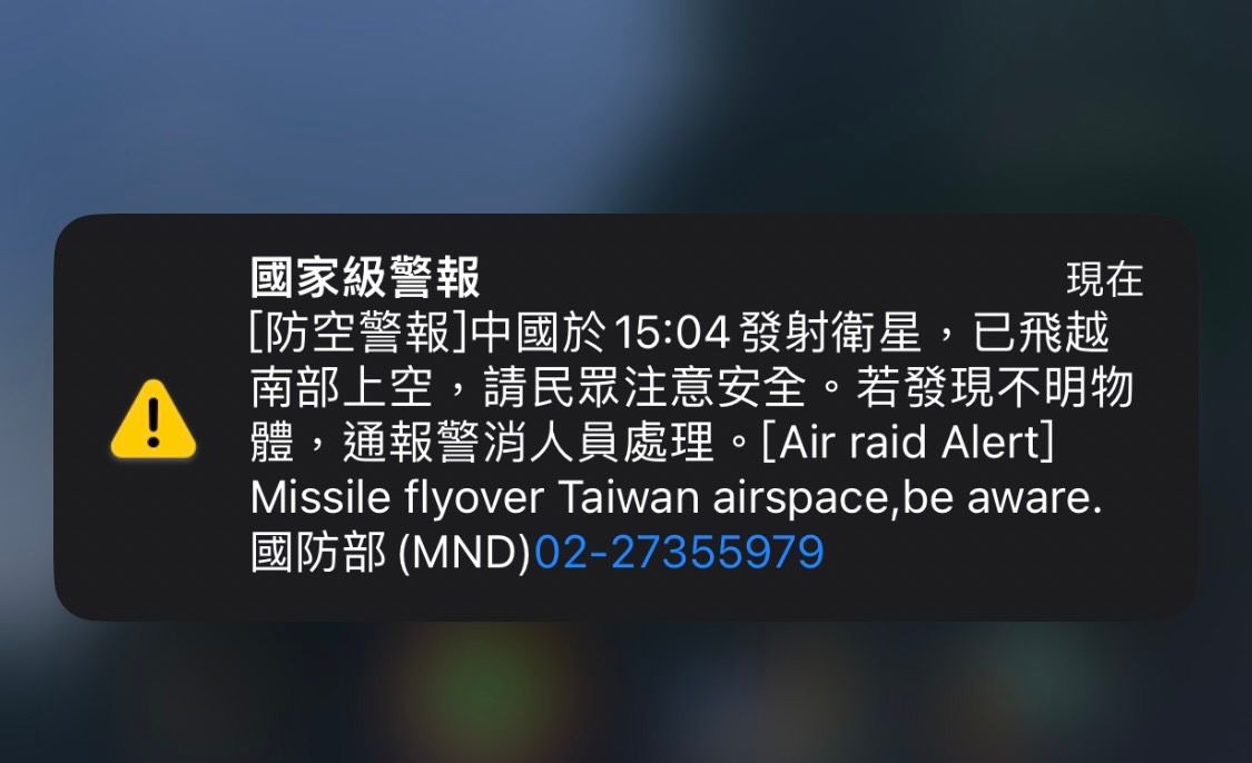全台今天下午國家級警報大響,國防部示警,中國於下午3時4分發射衛星,已飛越南部上空,提醒民眾注意安全,但其英文版用字的「Missile(飛彈)」卻引發討論,稍早國防部針對此事致歉。不過,過去中國發射飛彈飛越台灣上空沒警報,今天射衛星卻發出警報,狀況也引發民眾討論,到底什麼樣的狀況下才會收到告警訊息。