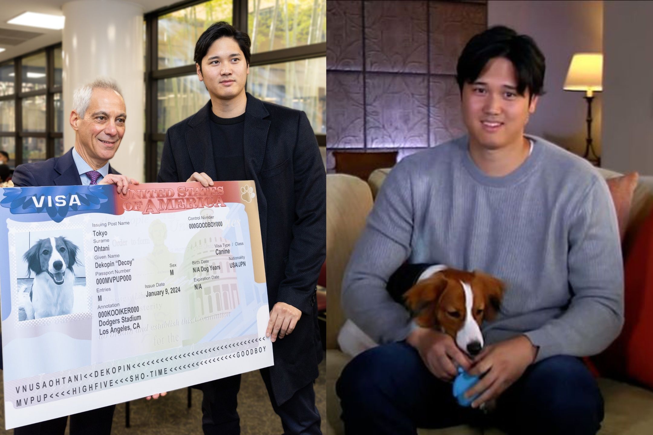 美國職棒大聯盟(MLB)日籍球星大谷翔平近日悄悄返回日本,並拜訪了美國駐日大使館,大使館今(11日)發文PO出認證照,大谷與大使伊曼紐爾(Rahm Emanuel)拿著愛犬「Decoy」的美國簽證合影,而從上方資訊顯示,「Decoy」擁有美、日雙重國籍。