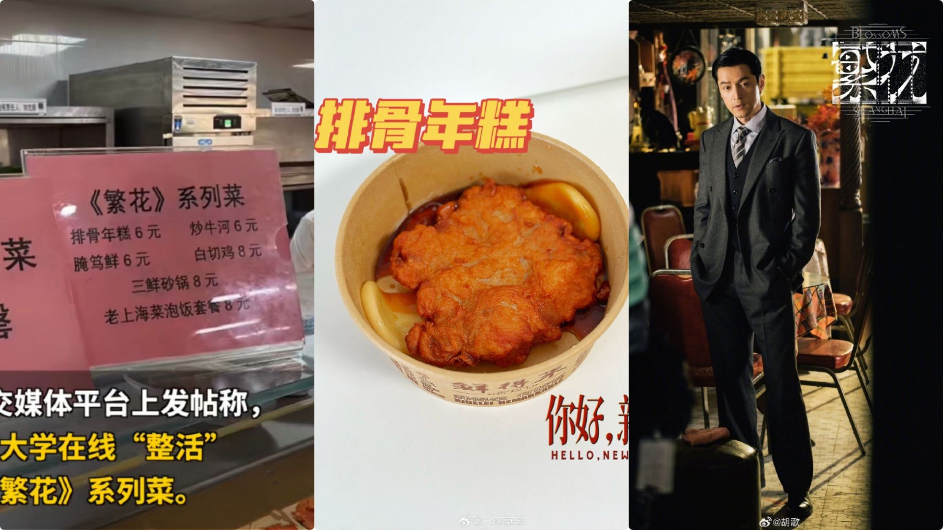 胡歌主演的《繁花》剛播完,但熱度持續延燒,繁花熱這把火從和平飯店套房燒到西裝店再燒到校園,劇中的年糕排骨的烹飪方法最近持續在網上發酵,上海師範大學搭上熱潮,食堂推出《繁花》系列菜單,包括排骨年糕、泡飯等6款美食,價格為6元或8元人民幣。食堂工作人員透露,這系列菜色很受歡迎,「一出來就賣掉了!」但也表示就賣這陣子而已。