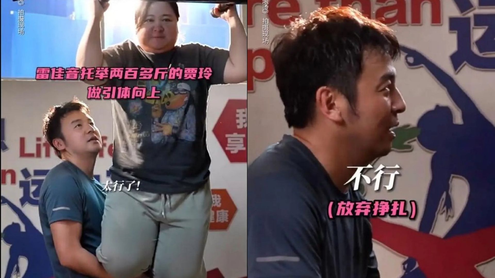 於是原本幫忙托住賈玲的工作人員離開,瞬間賈玲的體重全落在雷佳音身上,他表情猙獰,一度軟腳下沉。沒想到賈玲沒放過他,繼續大喊「起!起!起!」逼他再使力往上扛,他受不了開始慘叫,賈玲連忙指揮工作人員來救援:「快來救命!」