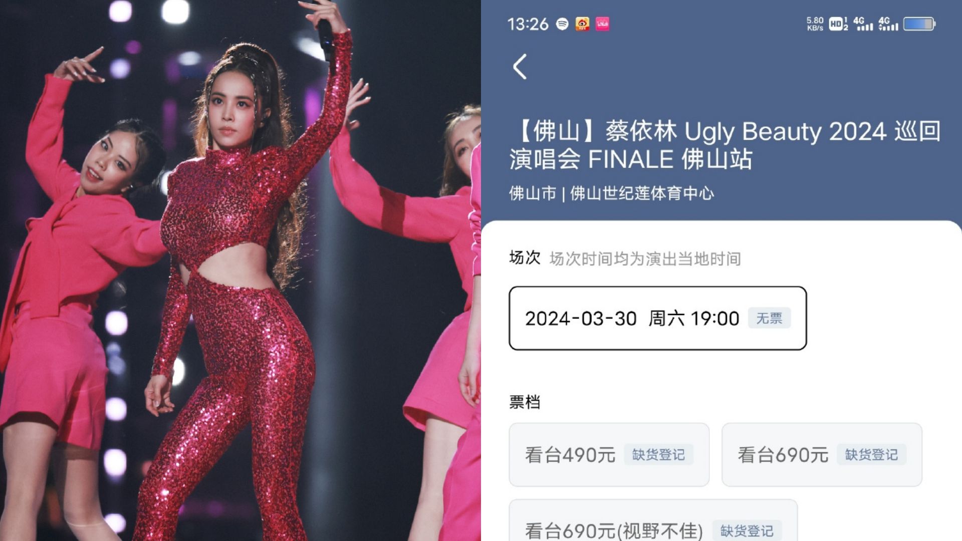 已被視為華語女歌手唱跳天花板的蔡依林(Jolin),去年在中國的巡演造成轟動,加上在湖南衛視跨年18分鐘震撼人心的歌舞,她今年巡演首場3月30日廣東佛山站的門票,今天下午1點26分開賣,3.6萬張門票果真離譜地極速秒殺,網路湧現大批槓龜粉絲哀號,更有粉絲秀出有時間顯示的購票網站截圖,1點26分瞬間八種票價都顯示為缺貨登記,真的是一秒定生死。