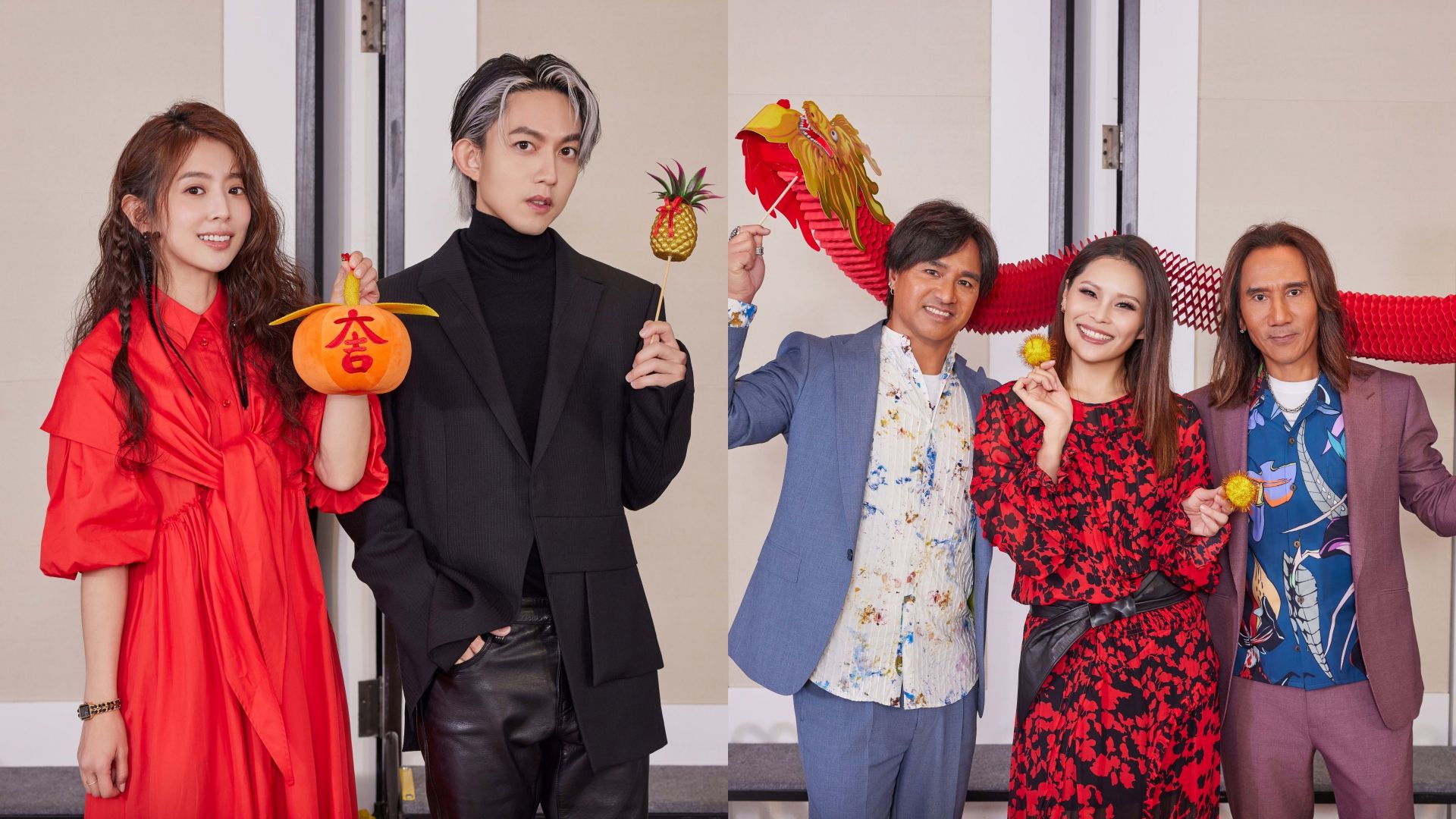 林宥嘉、丁文琪、動力火車、周蕙、木木(林葦妮)等30位藝人,昨參加所屬華研國際的年終尾牙宴,因為2024年是龍年,幸運色是「紅色」,因此設定「鴻(紅)圖大展 和樂龍龍」的尾牙Dress Code主題,穿一身黑的林宥嘉主動說明:「你們看我身上好像沒有紅色對不對?因為我的紅色在這邊(手指老婆丁文琪)。」一身紅的丁文琪幽默地表示:「我是林宥嘉的紅包袋。」