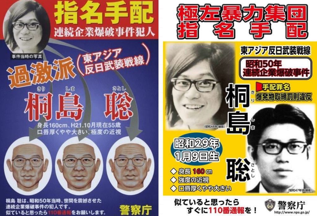 根據通緝資料顯示,「桐島聰」出生廣島縣神邊町,在縣內的高中畢業後,於1972年就讀明治學院大學,1975年4月18日,「桐島聰」涉嫌在東京銀座的韓國產業經濟研究所大門裝置定時炸彈,爆炸導致建築物受損,同年5月遭警方通緝後,他在澀谷領了現金並和老家的父親通話,之後便消失得無影無蹤。