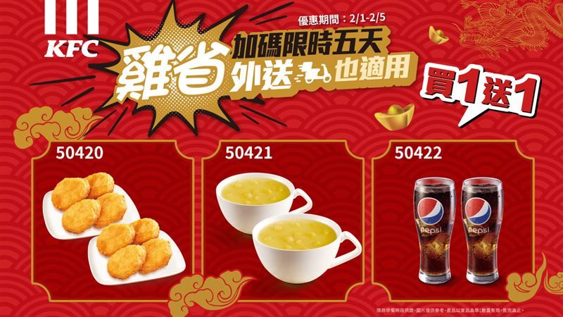 而春節將至,肯德基也於2月1日至5日同步推出新春回饋,包括上校雞塊、玉米濃湯、百事可樂皆享有買1送1優惠,使用「隱藏優惠碼」最低下殺48折,不分內用、外帶外送、臨櫃、官網、PK雙饗卡App皆適用,還有選購指定桶餐,加1元多1塊咔啦脆雞,購買XL超豪肯套餐,加1元多一個原味蛋撻。