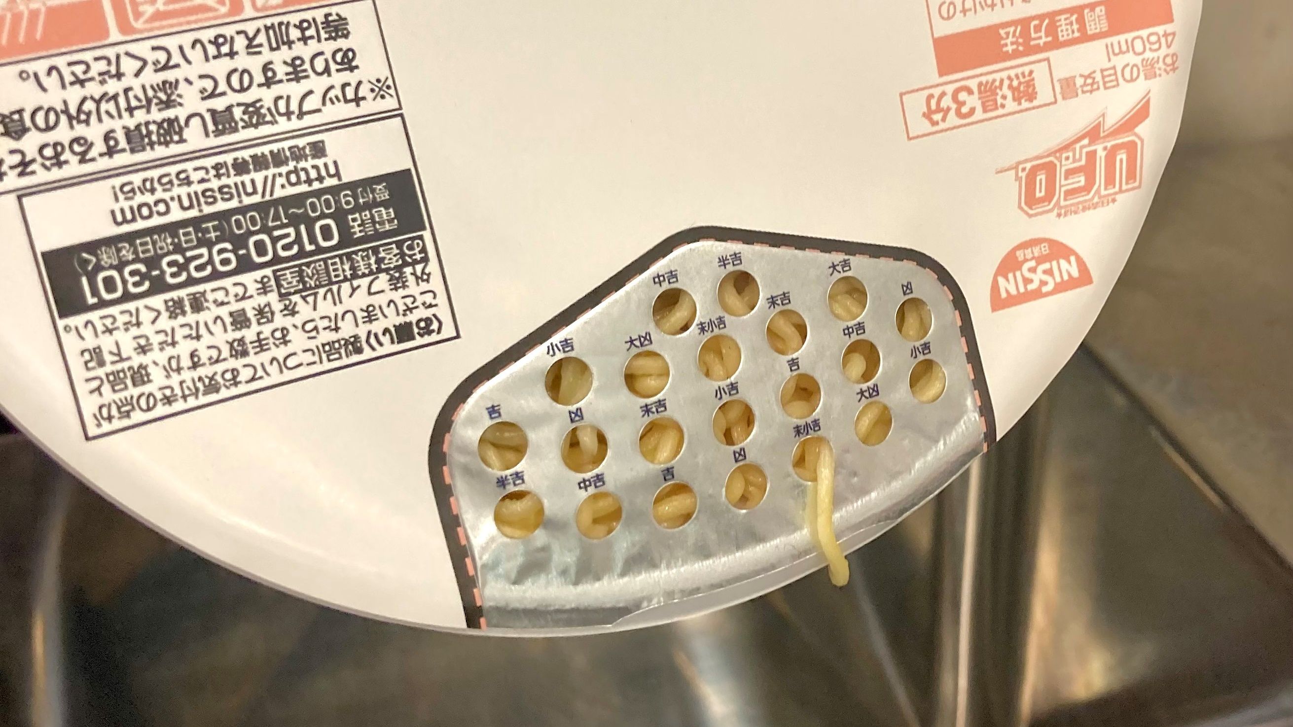 瀝乾湯汁是吃乾泡麵不可省略的步驟,為了方便過濾熱水,日清集團的杯麵蓋設計都會有不少孔洞,而旗下的炒泡麵品牌「日清焼そばU.F.O.」日前在社群平台X上傳一張有趣照片,瀝水孔被巧妙地做成抽籤樣式,每一個孔洞上都印有吉凶字樣,似乎代表麵條最先從哪個瀝水孔出來,就代表著今日運勢如何。