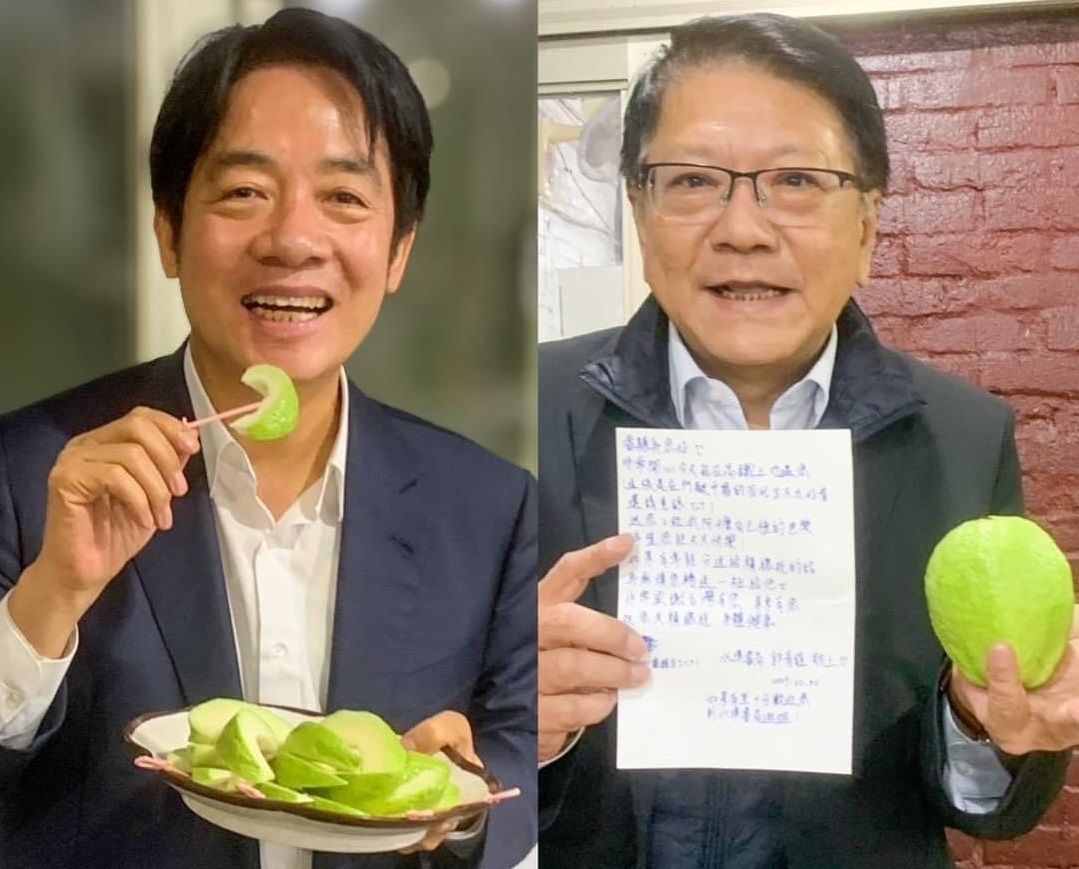 潘孟安(右)受支持者委託將芭樂送到賴清德(左)手上。(翻攝自潘孟安臉書)