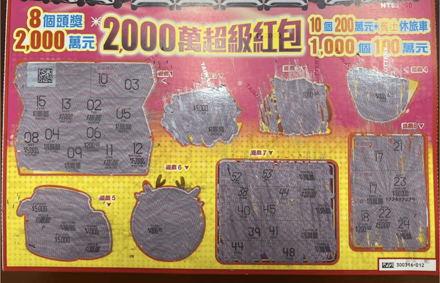 台彩指出,「2,000萬超級紅包」刮刮樂共有8個頭獎2,000萬元、10個200萬元+賓士休旅車、1,000個100萬元。根據統計,截至2月12日止,已刮出3個2,000萬元、4個200萬元+賓士休旅車、163個100萬元。