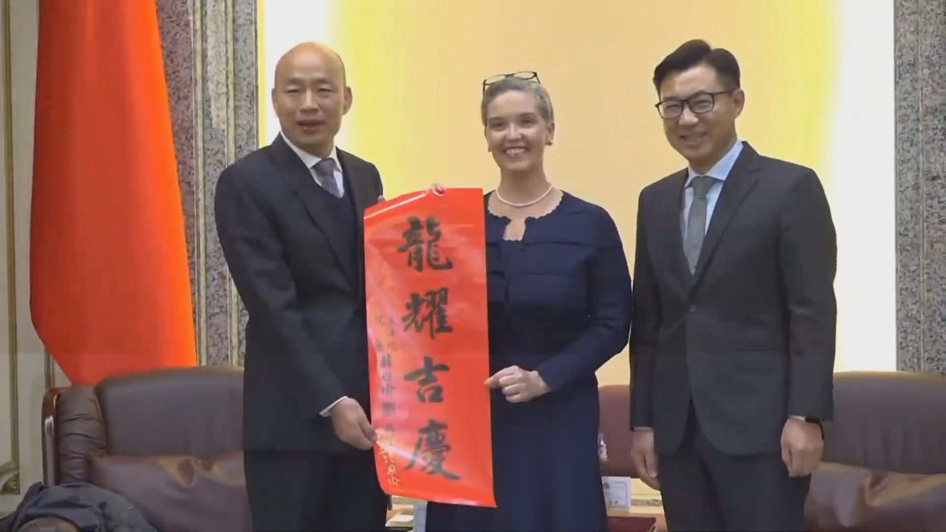 立法院長韓國瑜今(16日)展開國會外交首秀,接見美國在台協會(AIT)處長孫曉雅,他現場致贈落款的春聯「龍耀吉慶」,在旁的副院長江啟臣問孫知道什麼意思嗎?孫曉雅指著說出「龍…something…吉…」,似乎看不懂「耀」和「慶」字,韓國瑜立即解釋「Have a good Luck(祝好運)」,讓她恍然大悟,互動輕鬆有趣。