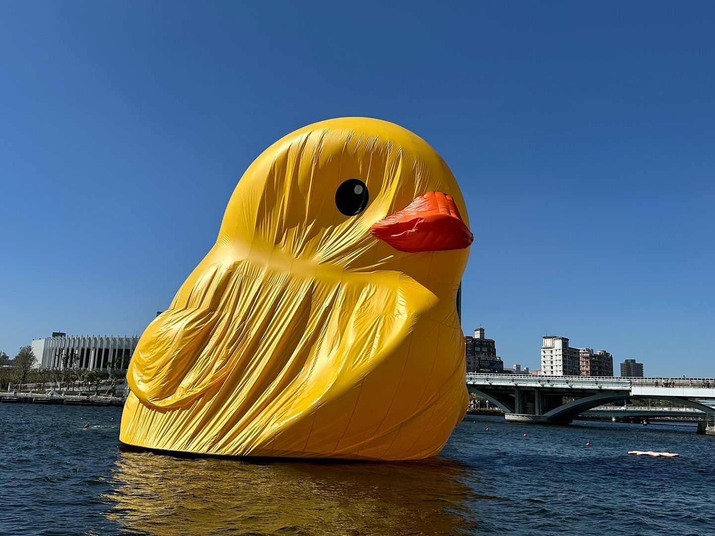 黃色小鴨睽違10年再次「游」進高雄愛河灣,不過在展期結束前5日,今天(21日)高雄突然刮起6級強風,導致黃色小鴨電力裝置受影響,頭部與身體凹陷下去。高雄市政府觀光局局長高閔琳表示,目前工作人員正進行相關檢測作業,並貼出黃色小鴨恢復中的照片。