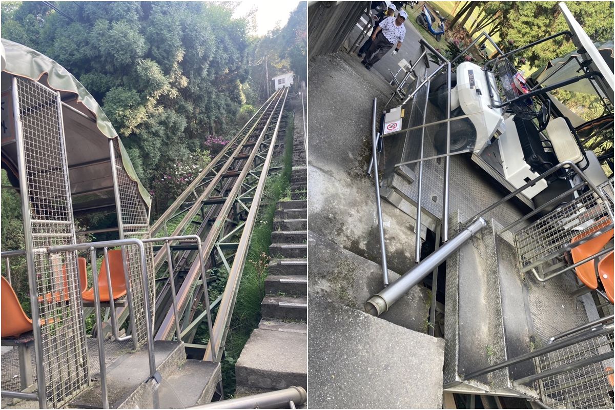 台中市豐原高爾夫球場今天下午3點10分驚傳意外,場內一條往上坡前行的軌道車鋼索斷裂,整輛車子往下滑行10多公尺,造成4男1女從車上翻落受傷,有人甚至脫臼,消防局出動5個分隊前往救援,還好傷者都意識清楚,陸續送醫治療當中。