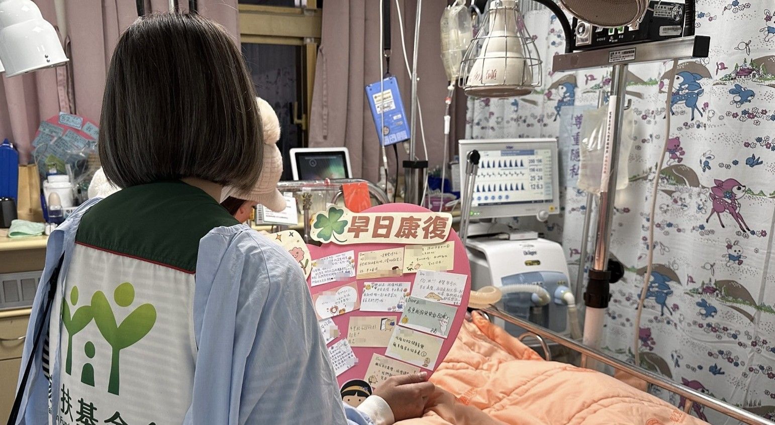 家扶中心還將大家寫的加油祝福卡片帶來,放在病床旁邊陪伴小姊妹,鼓勵「趕緊恢復健康好嗎」,表示家扶中心的主任想再帶小姊妹參加暑期課輔班、戶外教學,還有去餐館享用牛排和耶誕大餐。