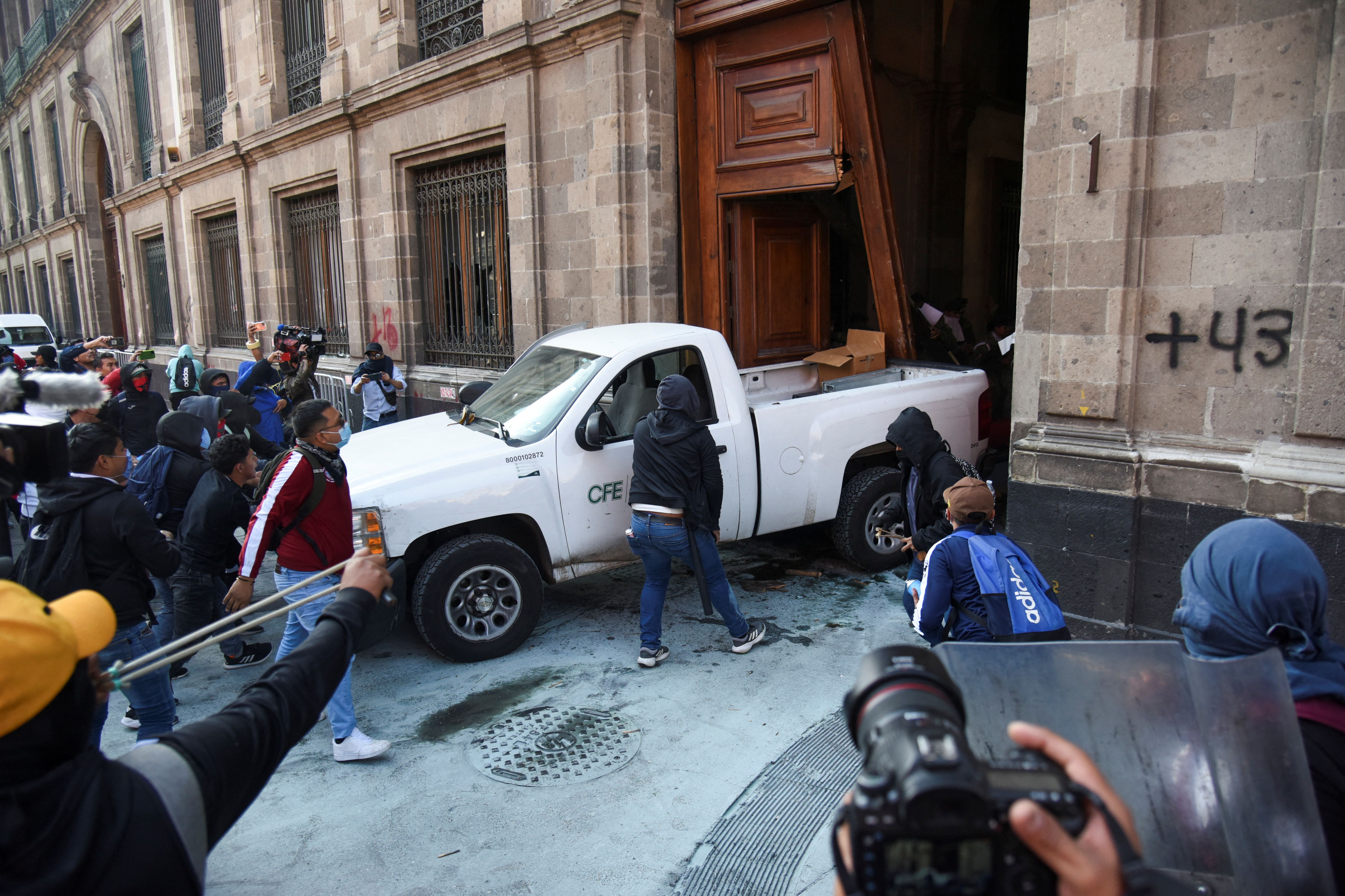 「活捉學生,就讓學生活著回來!」墨國首都墨西哥城廣場,週三(6日)上午聚集大批抗議民眾,其中包含2014年失蹤學生家屬,突然,一輛隸屬墨西哥國家電力公司的白色皮卡車,反覆衝撞國家宮(National Palace)總統府大門,最終百年木門被撞破,民眾爆出振奮吼叫聲,有人趁勢想闖進去,但都遭警方以催淚瓦斯驅散。
