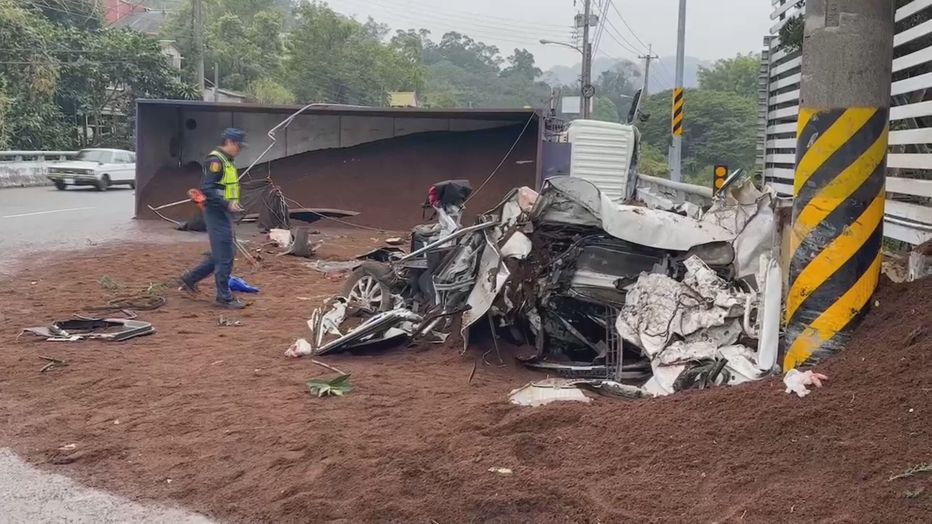 台中市北屯區今(10日)早發生嚴重車禍,59歲蘇姓砂石車駕駛過彎時失控翻覆,當場壓扁一旁的白色休旅車,車內母子被救出後,19歲的吳姓兒子意識模糊、43歲廖姓女子則失去生命跡象,雙雙被送往醫院搶救,蘇男則因擦挫傷送院,下午2時許到警局做筆錄時,自稱當時開車速度不快,急踩煞車後仍不幸翻覆。