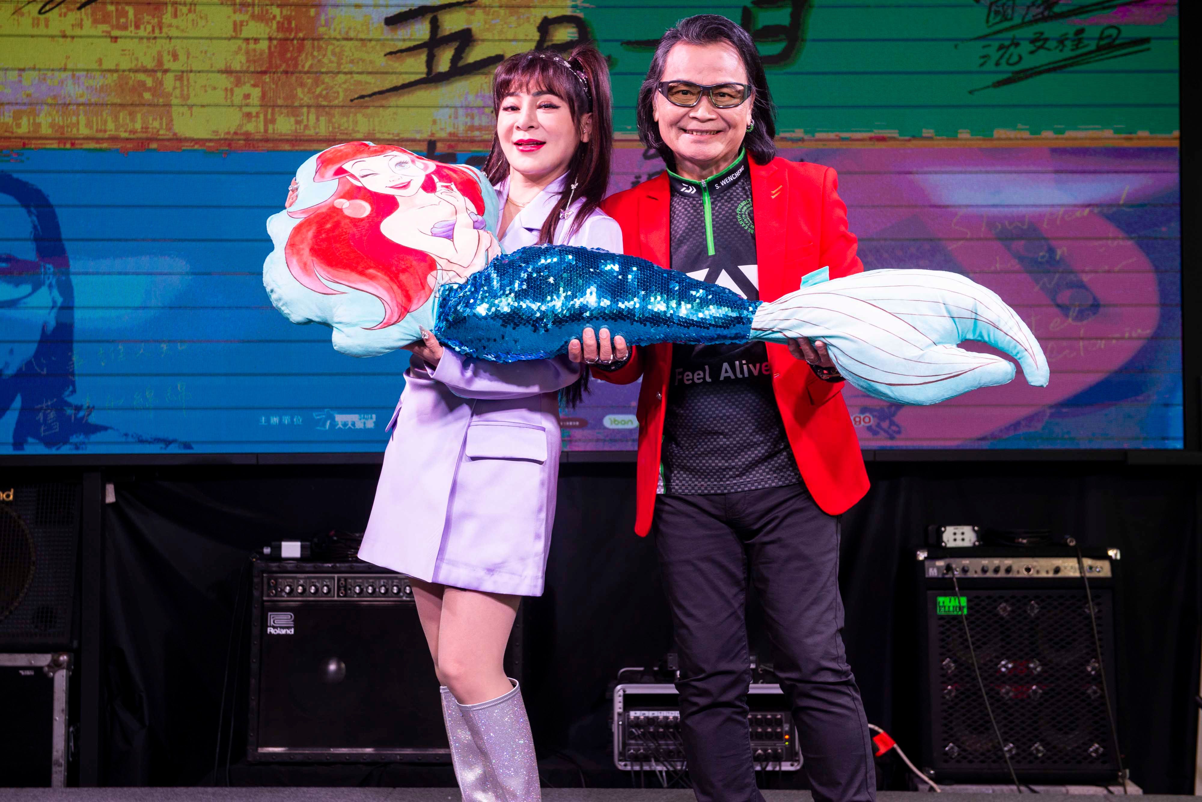 沈文程昨宣傳5月1日在台北TICC演唱會,妙語如珠的他邀來尺度一樣葷腥不忌的王彩樺站台,兩人把記者會當歌廳秀來玩,王彩樺獻上「美人魚」玩偶,透露沈文程有慈悲心,「沈哥每次釣魚都放生,但小妹我希望單身的沈哥能夠找到人生的幸福,若遇到美人魚般的對象,可千萬別放手呦!」68歲沈文程去年鬆口二度離婚,見到禮物搞笑回應:「萬一有感覺怎麼辦?」末了還用諧音讚她是個「採花賊」,讓全場笑聲如雷。