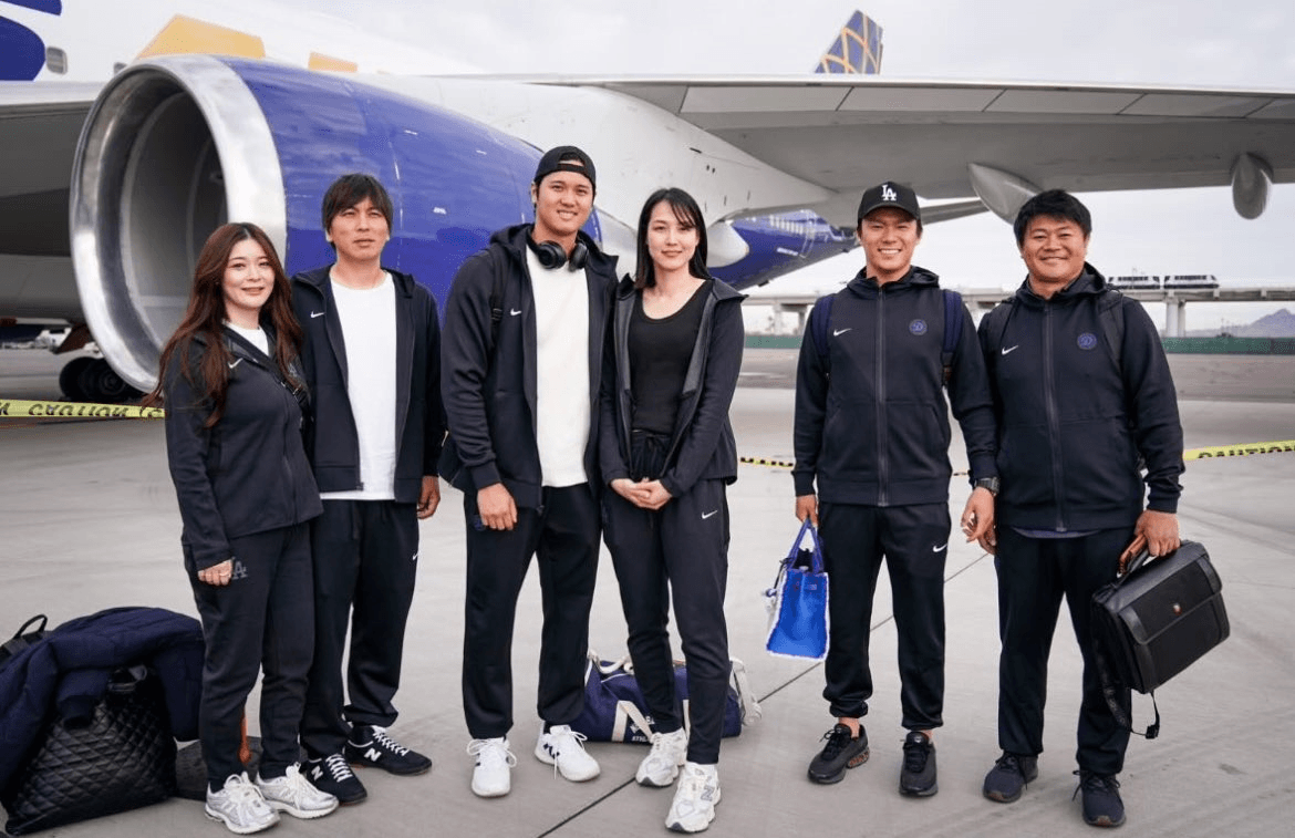 為了接下來的海外開幕戰,大谷翔平現身南韓首爾,14日深夜在IG限動貼出6人在停機坪上的合照,左手邊2位是貼身翻譯水原一平和太太野間えりか,右手邊因為錯位、看似牽起小手的,是道奇投手山本由伸和他的翻譯園田芳大,而靠在大谷身邊的,就是日前瘋傳是大谷新婚妻的日本女籃國手「田中真美子」,粉絲又驚又喜,連MLB官方社群都轉發該張照片。