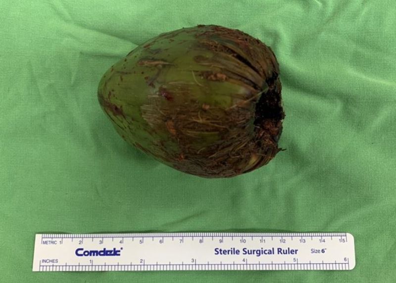 醫生一開始嘗試插管導尿及機械協助排尿,並徒手伸進男子肛門,但無法將椰子取出,考量再拖下去男子膀胱恐會爆炸,直腸也會因壓迫壞死,與男子討論後剖腹開腸才成功取出椰子,椰子長寬高約7.5x5.7x5.5公分。但男子直到出院前都不願說明椰子是如何塞進去。這起案例事後被陳致一醫師投稿,已成功刊登於國際期刊《英國醫學期刊》110卷,第一期, 2023年1月,頁碼123。