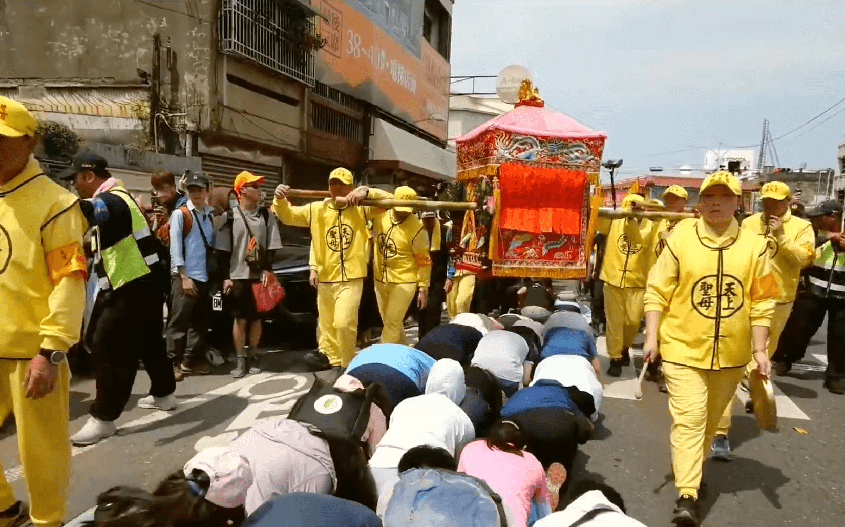 白沙屯媽祖進香,不少民眾都會趴跪在地等待「鑽轎底」祈福,昨天(22日)經過雲林縣政府外時,轎班先是提醒信眾趴下、將帽子取下,只見隊伍中一名身穿粉紅色上衣的孕婦也來鑽轎底,不過因為她的肚子太大,沒辦法完全趴下,也吸引轎班注意。