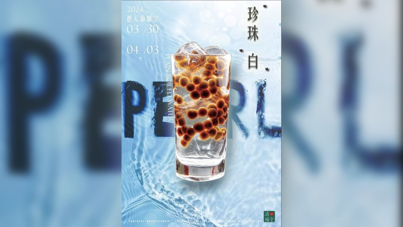 日前一名網友在Threads曬出一張聊天截圖,只見照片中的海報上寫著大大的三個字「珍珠白」,並註明是3月30日至4月3日的愚人節限定,右下角則有「清心福全」的飲料LOGO。照片裡的訊息更曝光了「珍珠白」的調配方式,「珍珠2匙+6分冰+5分糖、開水7分滿,最後倒入紙杯」,說穿了就是白開水加上珍珠,也讓原PO傻眼直呼,「清心福全,在跟我認真嗎」。