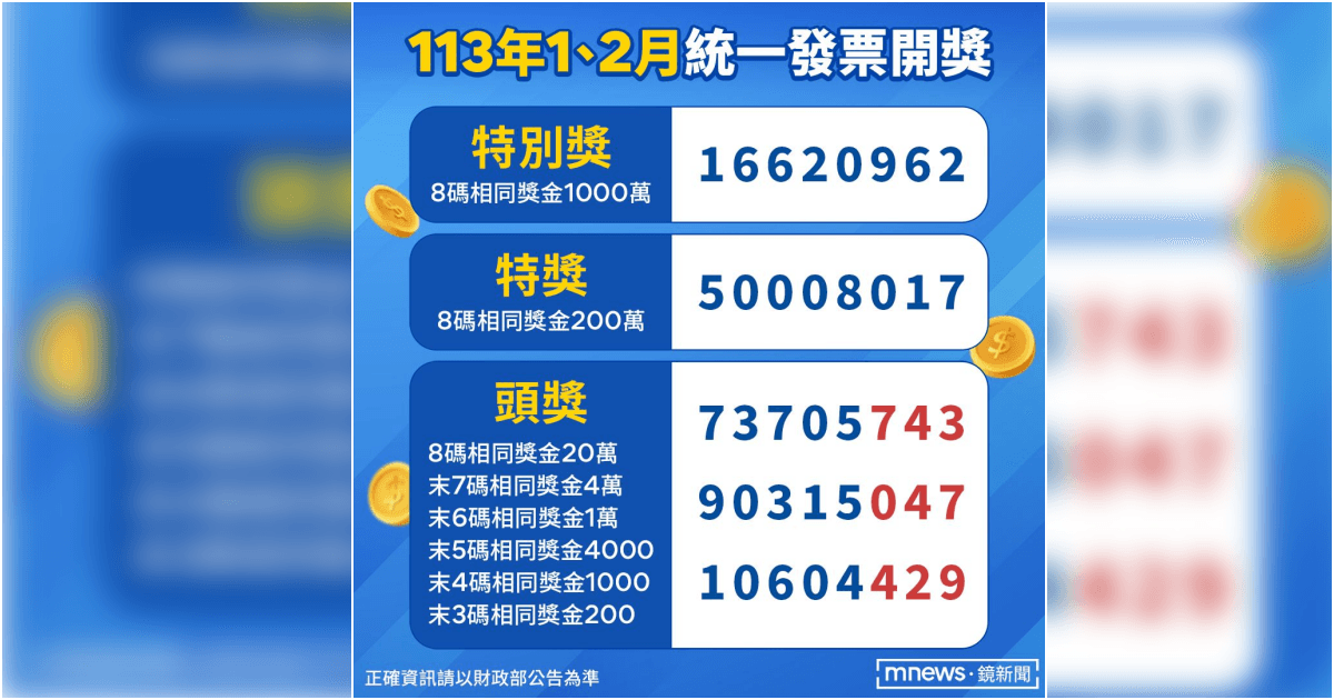 113年1、2月期統一發票中獎號碼今(25日)午開出,千萬特別獎號碼為16620962;200萬元特獎號碼為50008017,而3組20萬元頭獎號碼分別為「73705743」、「90315047」、「10604429」,本期發票領獎時間為4月6日起至7月5日。