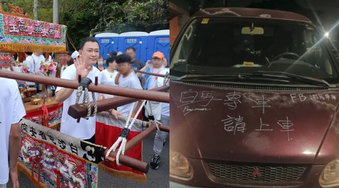 有網友今(26日)早在「白沙屯媽祖全球徒步聯誼會」臉書社團PO出一張照片,寫道「走完急行軍,又巧遇不老男神,值得了」,畫面中王識賢穿著樸素白T,仍不掩明星光芒,見民眾拍照也親民地微笑舉起手打招呼,照片吸引大批網友留言,「文欽叔就是帥,來看看神轎的雕工」、「哇在哪遇到的?我媽媽超愛他」、「真的是帥爆了」、「國民阿叔欸」。 網友「白馬哥」則在「白沙屯媽祖全球徒步聯誼會」發文表示,自己走了3天白沙屯媽祖的進香活動,也將自家的休旅車改造成「休息專車」,沿路開車載腿痠的信眾3天,並在車身寫上「請上車」、「累了請上車吧」、「不累嗎?別撐了」等字方便信徒辨認,不過隨著活動到了尾聲,「白馬哥」卻發現這些字跡擦不掉,原來是因為買成「油漆筆」,讓他哭笑不得「我該怎麼辦,我老婆說我買錯了」。