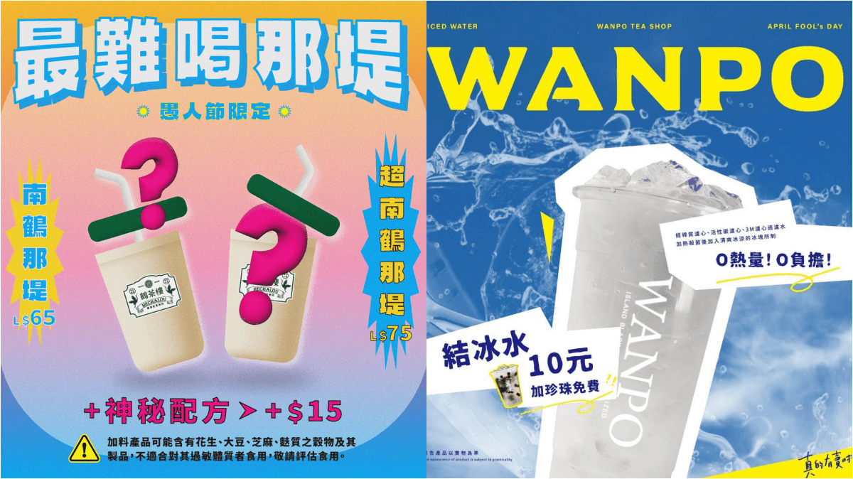鶴茶樓也緊抓愚人節商機,限定推出奇葩系列飲料「南鶴那堤」。這款飲料以「難喝」諧音為名,顧客無法選擇茶底,只能由店員隨機搭配加入鮮奶,增添神秘感。惡搞程度更有多種選擇,基礎款售價65元,包含兩種茶底加鮮奶;「超南鶴那堤」則是混搭四種茶底加鮮奶,並由店員隨機搭配兩種配料,需額外加價15元,消費者也可透過外送平台訂購。