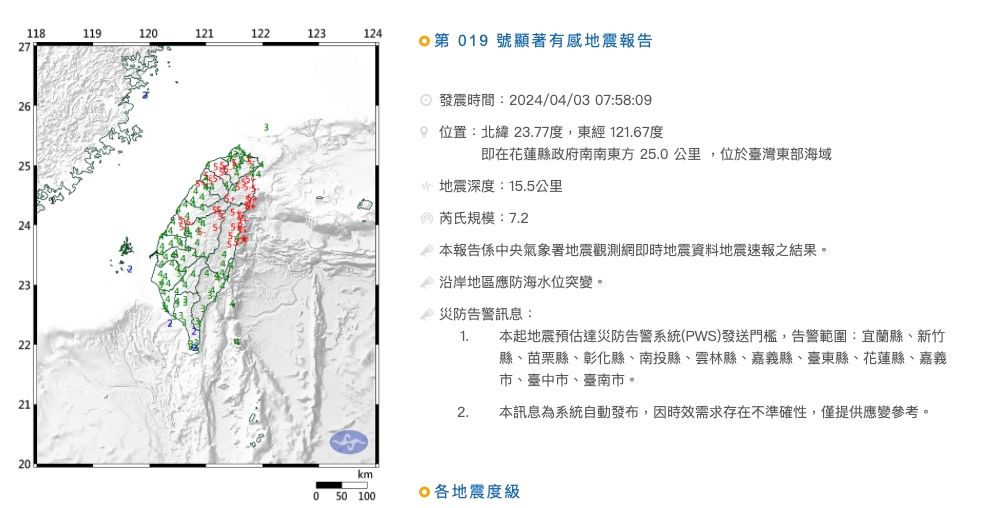 中央氣象署指出,7點58分的地震預估達災防告警系統(PWS)發送門檻,告警範圍:宜蘭縣、新竹縣、苗栗縣、彰化縣、南投縣、雲林縣、嘉義縣、台東縣、花蓮縣、嘉義市、台中市、台南市。