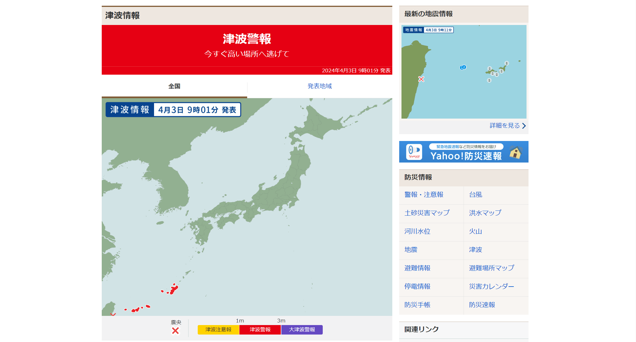 台灣時間7時58分傳出7.2強震,地震深度25公里,花蓮地區最嚴重,中央氣象署也發布海嘯警報,提醒沿海地區民眾提高警覺嚴加防範,注意海浪突然湧升所造成的危害。另外,鄰近台灣的沖繩宮古島和八重山群島也發布海嘯警報,預計會有3米的海嘯抵達。