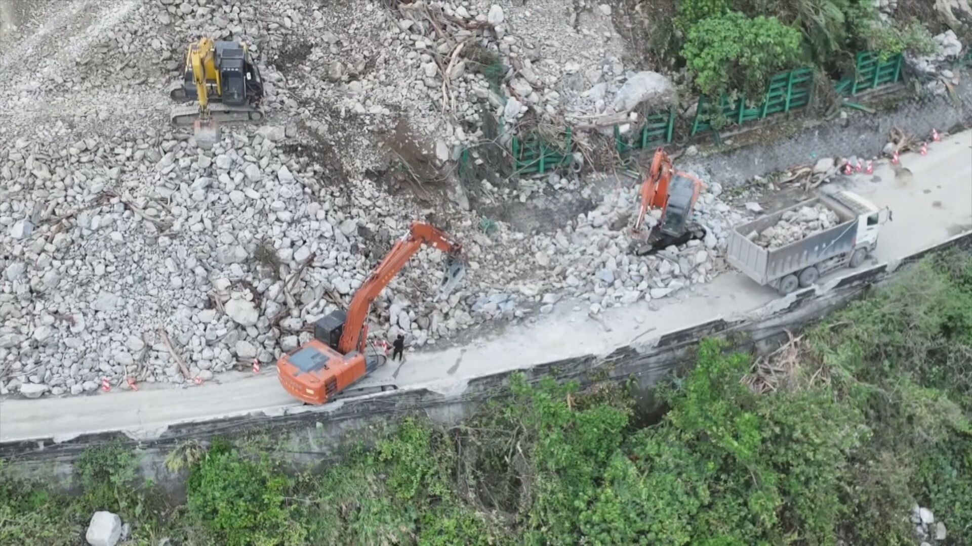 可以看到怪手不斷清理落石,不過許多地方的山壁,還是因為崩塌,光禿禿的一片,蘇花公路6日晚間6點緊急搶通,考量行車安全,4月30日前,每日只有開放3個時段供車輛通行,其他邊坡搶修還有加固作業則是同步進行當中。