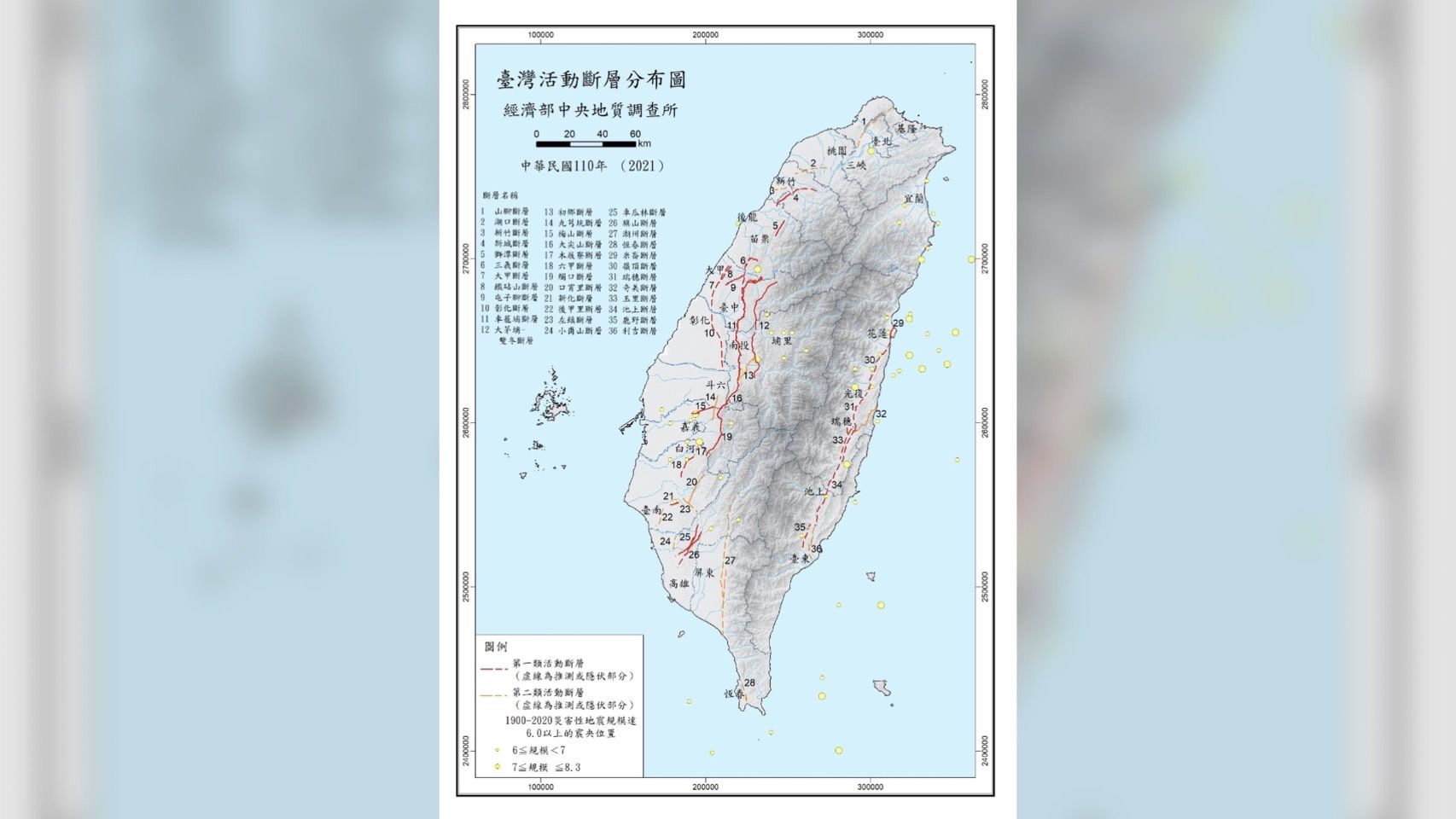 至於在該張活動斷層分布圖中,可見宜蘭地區無標示斷層,卻多次發生地震,顏宏元教授表示,宜蘭地區並非沒有斷層,是因宜蘭屬於平原地形,多為稻田,地面上看不到斷層的證據,但以地震活動來看,平原底下的深層地質結構,仍屬於地震頻繁的線性構造 ,且在宜蘭地區地下深度80、90公里有地震隱沒帶,龜山島附近又有沖繩海槽擴張所引發的地震,加上南澳地震帶等種種地理因素,因此宜蘭雖無斷層標示,但仍頻繁受到地震影響。相較之下,桃園仍是受地震影響最小的地區。
