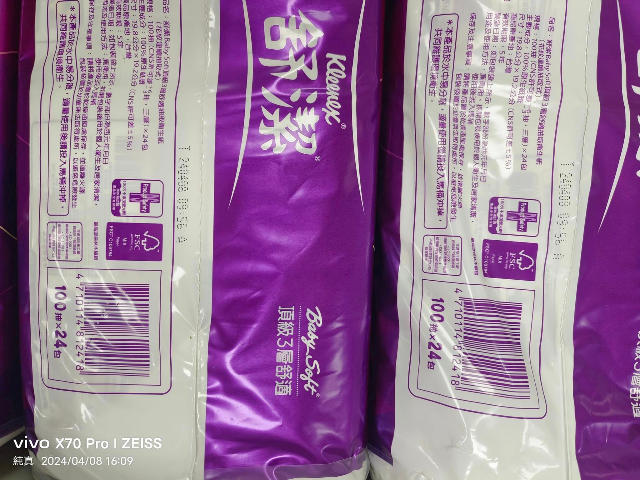 一名女網友8日在臉書社團「Costco好市多 商品經驗老實說」發文,指一早到好市多採買舒潔衛生紙,「買到最新鮮的出品」,只見網友拍下的商品照上印有240408 9:56,質疑衛生紙是當天一早9點56分才生產,「真懷疑制(製)造未來的日期」。雖然網友自稱一早採買,但曬出的照片拍攝時間則顯示下午4點9分。