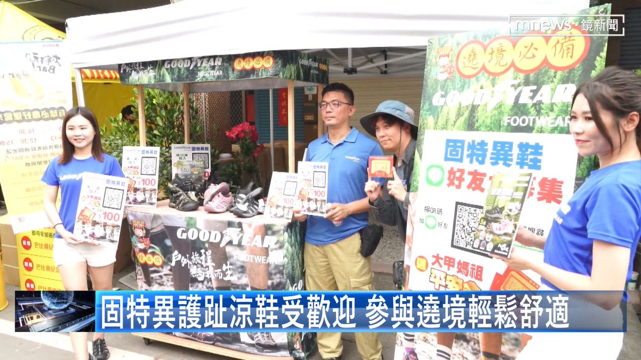 奉天宮前廣場,固特異鞋在現場展示今年新款的護趾運動涼鞋,不少民眾經過大讚固特異鞋舒適好穿,遶境長時間穿著都很舒適。固特異鞋業務主任張敬仁說,今年最熱賣的護趾涼鞋,「針對亞洲人寬厚的腳型,提供3E寬楦設計一體成型的護趾鞋頭可以保護腳趾頭;舒適的緩震中底,可吸收平時足部走路的足部壓力。」