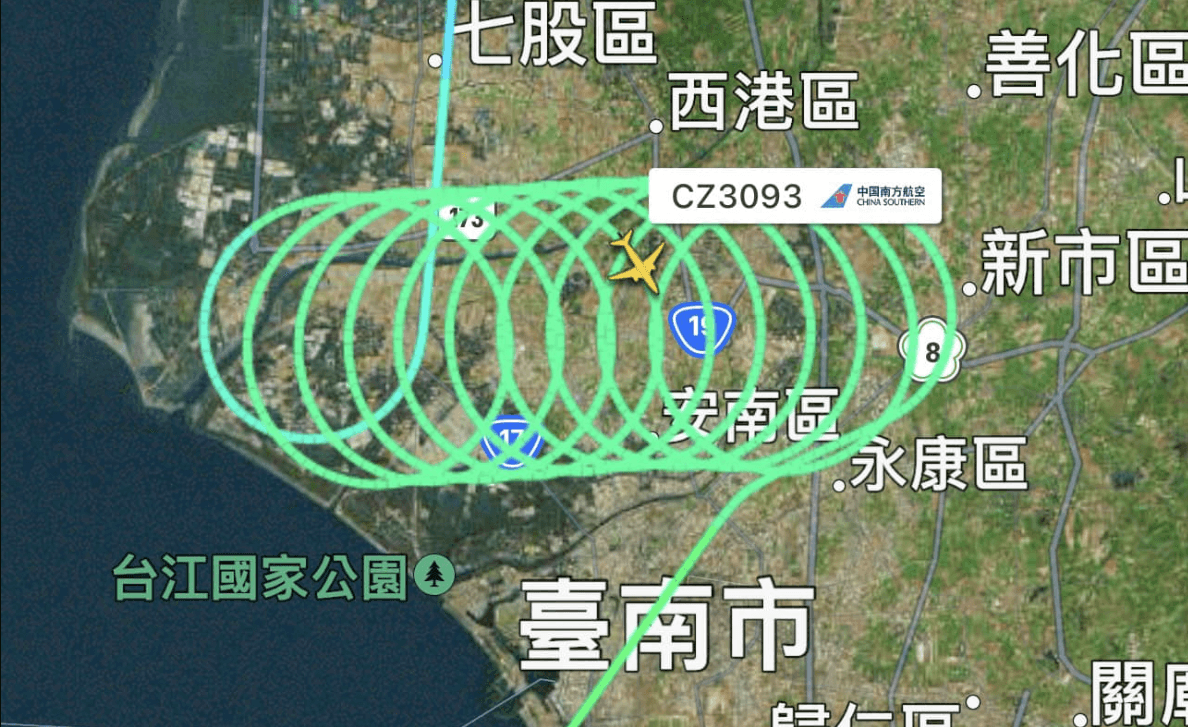 臉書粉專「台南式 Tainan Style」今(28日)發布一則貼文,直呼「沒走過圓環,不算到過台南,就算你在空中也一樣」。內容為24日一架中國南方航空CZ3093班機,從武漢飛往高雄的飛行軌跡圖,只見飛機航行至台南上空在等待降落指令期間,於空中盤旋了40分鐘,飛行軌跡則畫出了11個圓圈後,才再繼續往高雄前進並順利降落。